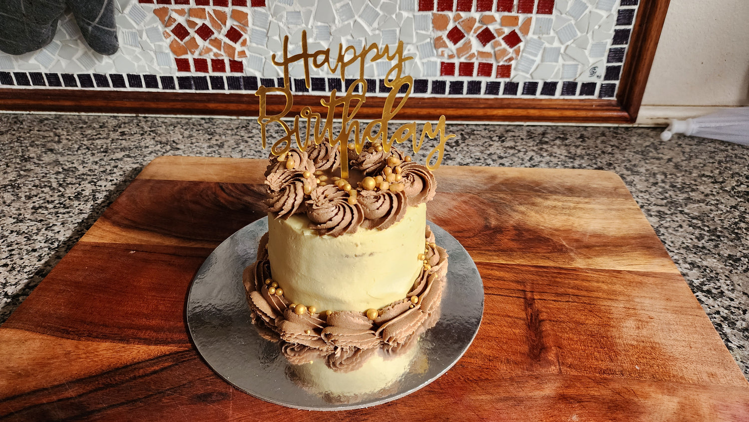 Caramel 2-layer cake with chocolate custard filling topped with choc caramel buttercream icing, gold pearls and caramel sauce.