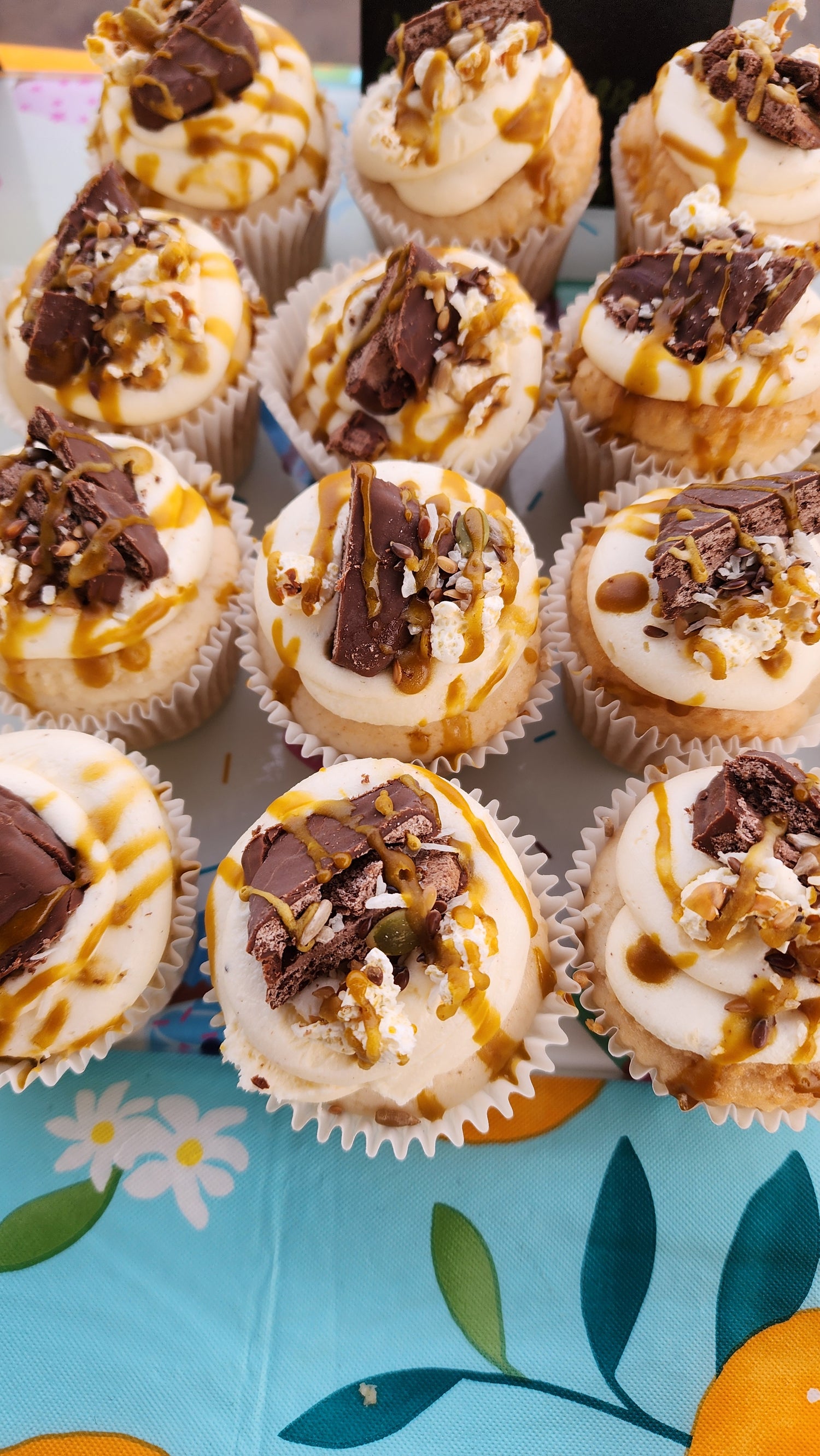 Vanilla cupcake base with a vanilla butter cream topped with chocolate biscuit, assorted seeds and coconut flakes, salted popcorn and a drizzle of salted caramel icing.