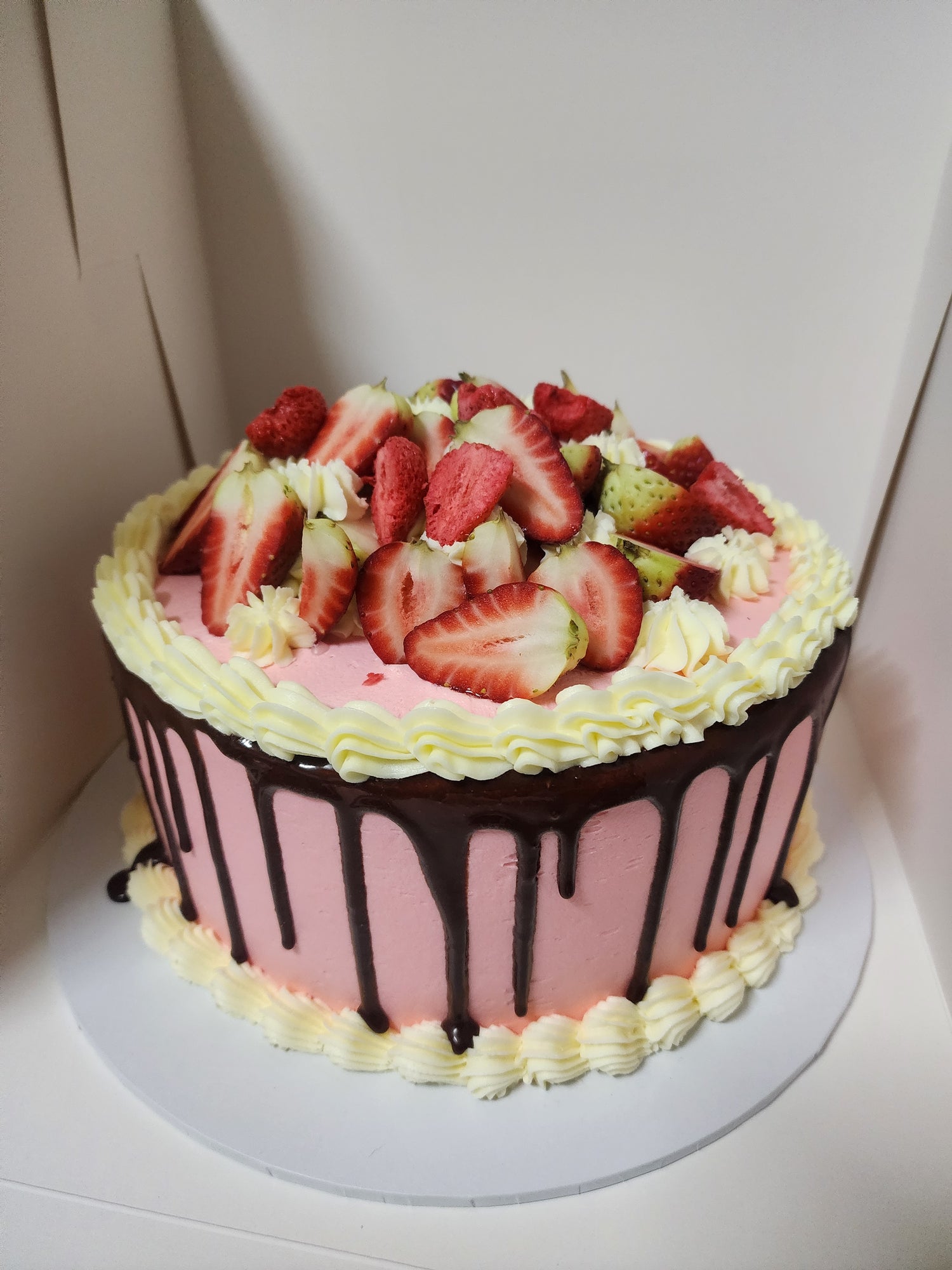 Delicious 10" strawberries and cream cake, vanilla cake with a layer of fresh strawberries and butter cream in the middle topped with strawberry and vanilla buttercream, fresh and freeze dried strawberries and a chocolate icing drip.