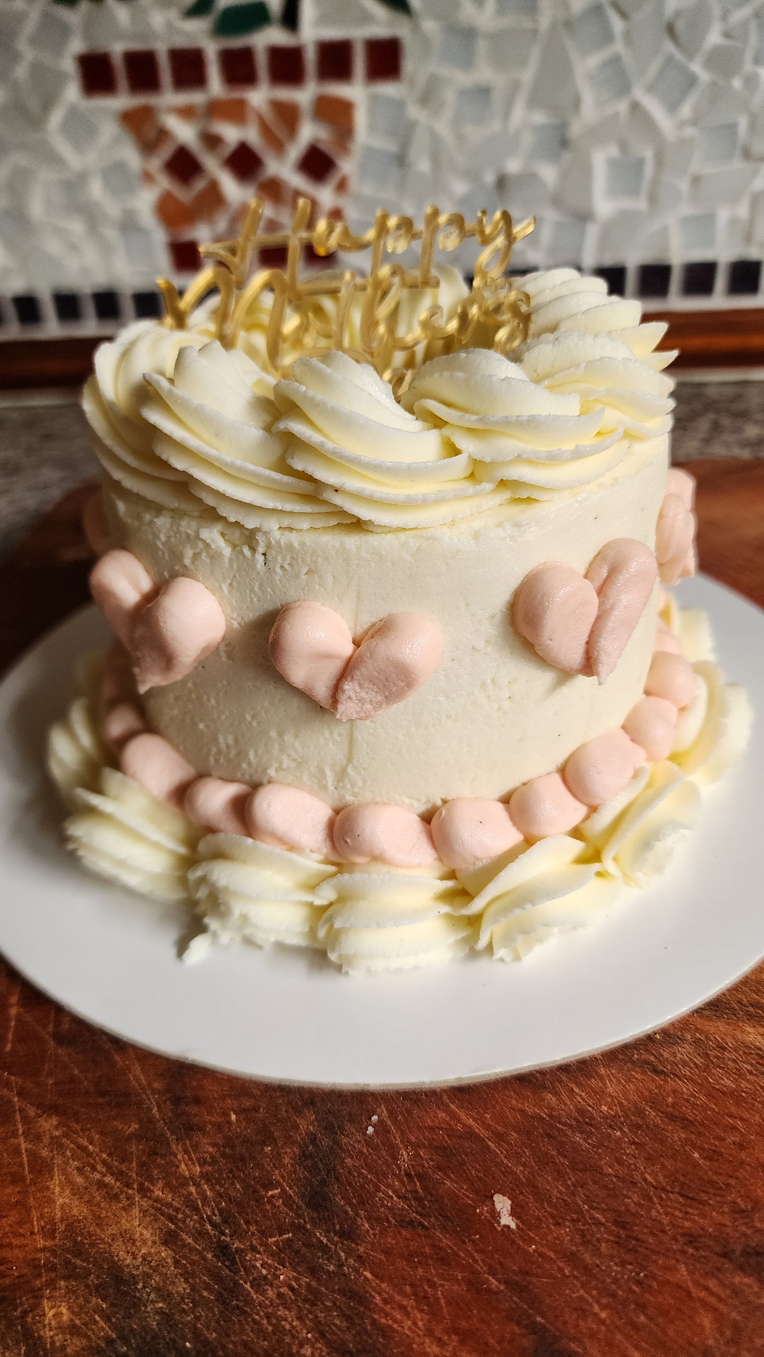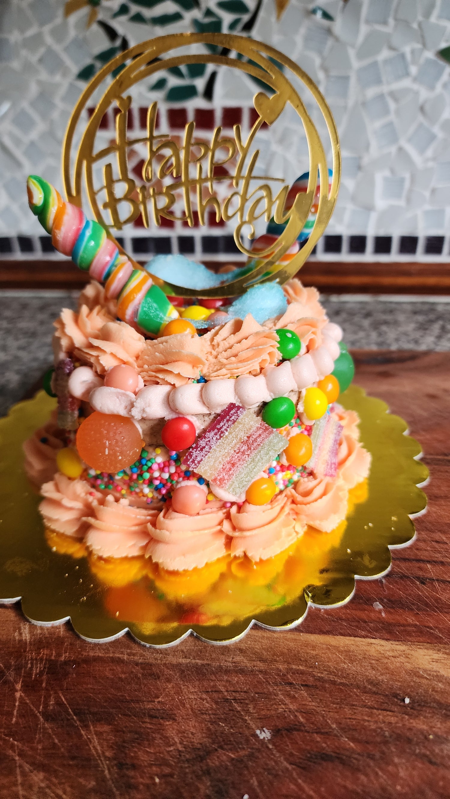 Delicious 4 inch vanilla cake with bubblegum flavoured buttercream icing topped with various vegan and Gluten free lollies.